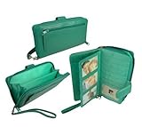 Not only carry everything you need - carry everything you want! This useful and durable wallet can fit just about everything while keeping you organized. The front has a slip pocket on the folded flap part. It is secured with a snap flap to keep all the items with in secure. Inside this part are 8 credit card slots, two of them with ID windows. There is an attached checkbook cover conveniently placed by the pen holder. There is also a flap in between the checkbook and card slots that is a photoflip: 6 picture windows so you can see your family, friends, and pets every time you use your wallet. The inside features do not stop there! The other side of the wallet is large zip-around compartment. Inside are two large expandable pockets AND a removable card/ID holder for those times when you don't want the bulk. An expandable zippered change compartment is on the back of the wallet. This wallet can fit in your handbag, or you can use it as a wristlet or mini-purse with its removable wrist strap. Finally a wallet with space for everything! A must have - The Incredible Bulk is sensible, durable and made from smooth, sturdy faux leather. Measures 8x4.5 inches. The width? It's up to you! Leave it flat or stuff it full! Available in Dark Pink, Black, Teal, Purple, Bronze.Relate Items