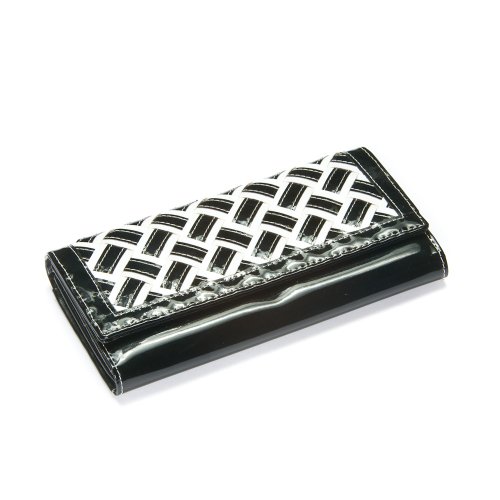 This classic style tri-fold faux patent leather wallet features a black and white woven fabric on the front flap. This wallet has a snap closure, 11 credit card slots and 1 ID slot inside. Also inside are two open pockets for cash and receipts and a zipper pocket for change. The wallet measures 7.5" wide by 4" high when closed. Opens to 11".** CERTAIN CONTENT THAT APPEARS THIS SITE COMES FROM AMAZON SERVICES LLC. THIS CONTENT IS PROVIDED ‘AS IS’ AND IS SUBJECT TO CHANGE OR REMOVAL AT ANY TIME.